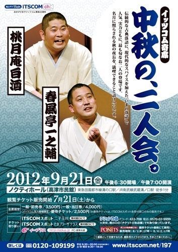 「中秋の二人会」 出演:桃月庵白酒、春風亭一之輔 期日:2012年9月21日(金) 6時半開場 7時開演 場所:ノクティホール 東急田園都市線溝の口駅 徒歩1分 チケット:前売り¥3500 当日¥4000 問い合わせ:0120−109199 楽しさ200%、良い席ございます。お誘いあわせの上 是非お越しくださいませ。 管理人さん失礼いたしました