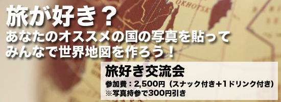 北千住で【旅好き交流会】 参加費:2,500円(スナック+1ドリンク) ※旅先で撮った写真、または行ってみたい国の写真を持ってくれば300円引き! 海外旅行、国内旅行 みんなでワイワイ楽しく行く旅行もいいけど・・・ やっぱり自由気ままな一人旅が好き そんな人も多いはず!!(案内人はそのタイプです(笑)) でも・・・ 旅に行くのは一人でも 旅の話は一人じゃできない 『この国は良かった!』 『こんな面白いところがある!』 『ここは危なかった』 『次はこの国に行きたい!』などなど 旅好き同