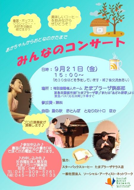 〜親子で・お友達で・みんなで音楽を楽しみましょう〜 みんなのコンサート たまプラーザ駅、あざみ野駅からバスで少し行った「元石川町」にあります、特別養護老人ホーム、「たまプラーザ倶楽部」にて、定期的に無料のコンサートを行なっています。 今回は、歌、フルート、ピアノ、それぞれプロの演奏家が身近な曲、ホッとする曲などをお届けします。 スターバックス たまプラーザテラス店さんのご協力も得て、美味しい本格コーヒーと、生演奏 地域の方々と施設の方々との交流、またここか
