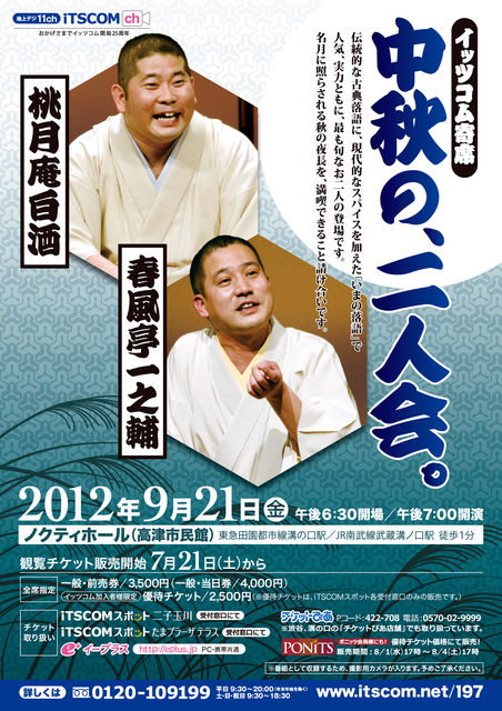 「イッツコム寄席 中秋の、二人会。」 桃月庵白酒・春風亭一之輔 伝統的な古典落語の、現代的なスパイスを加えた「いまの落語」で 人気、実力ともに、最も旬なお二人の登場です。 名月に照らされる秋の夜長を、満喫できること請け合いです。 【開催日時】2012年9月21日(金)18:30開場19:00開演 【会場】ノクティホール(高津市民館) [東急田園都市線溝の口駅・JR南武線武蔵溝ノ口駅 徒歩1分 マルイ12階] 【入場料】一般・前売り3,500円(一般・当日4,000円) ※イッツコム加入者優待あり(詳細は下記HPで) 公
