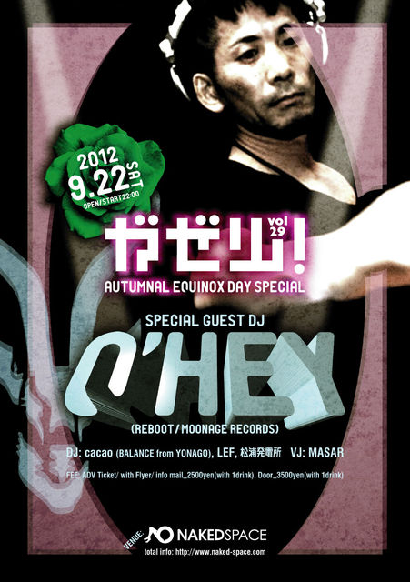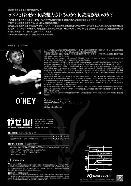 「ガゼル!vol.29 Autumnal Equinox Day special」@naked space 各月好評開催中のガゼル!テクノとは何か?何故魅力されるのか?何故飽きないのか? その模索もまたガゼルのテーマの一つ。 シンプルながら進化し続ける音のイマを出演者が全力でプレイ! 気持ち良い空間を体感できるハズ。楽しい事間違いなし! 夏の気配を色濃く残す9月22日ネイキッドスペースが記録的熱さを更新す。 今回は今年で14周年を迎え常に最先端の音を発し続けるテクノパーティーREBOOTの主催者にして MOONAGE RECORDSのオーナーであるQ'HEY氏を迎えて爆裂開催!!! 熱