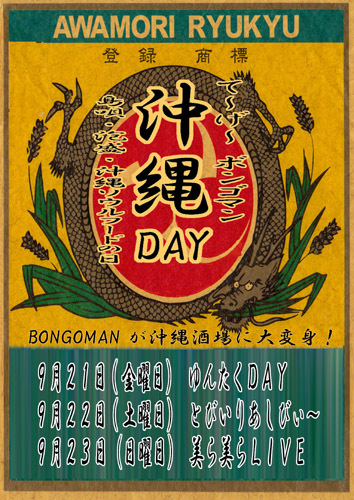 『BONGOMAN沖縄DAY美ら美らワンマンLIVE』 9月23日(日) OPEN18:00~ LIVE:19:30~ チャージ無料 要・予約 078−924−6654 明石市野々上3−13−7 JR西明石北徒歩5分 セブンイレブン東側