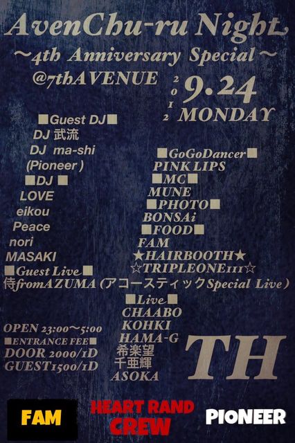 管理人様告知失礼します。 ☆AvenChu-ru Night 4周年☆ 〜4th Universally Special 〜 日頃のご愛顧ありがとうございます。この度、横浜平日月曜日、アバンチュールNight が、4周年を迎えます。皆様あっての今が迎えられと思ってます。是非、皆様で御祝いいたしましょう。 日頃の感謝を込めて最高の一夜にしたいと思っております。 Heart Rand Crew 一同 ■『AvenChu-ru Night とは……』 またの名を、火遊びの夜!!! 音楽と戯れるもよし、男子、女子で戯れるも よし、お酒に溺れるもよし,そんな最高の夜は,二度と帰って