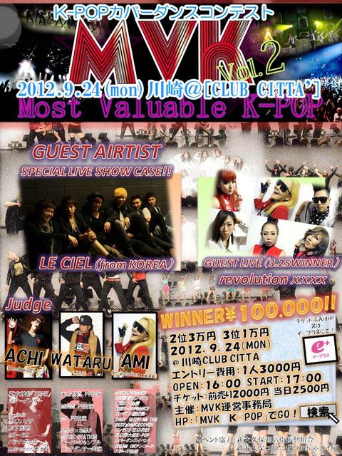 管理人様、失礼します。 K-POPを愛し、心からリスペクトするK-POPダンサーによるダンスコンテスト! 優勝賞金¥100,000!MVKが半年ぶりにカムバック!会場をCLUB CITTA川崎へと移し日本のK-POPダンサーが新たなドラマを繰り広げる! 初代チャンピオン「revolution xxxx」に続く2代目チャンピオンはどのチームなのか!?K-POPに精通する審査員陣に加え、各チームの観客動員数・投票数も審査の対象となる「オーディエンス投票システム」を採用したコンテスト。 一夜限りの祭典は超必見!ゲストアーティスト、審査員、メインMC等の詳細は今後随