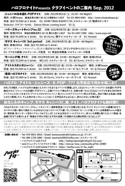 夏の全国ツアー開催を経て、尚もその熱の覚めやらない、 “ハロプロナイト” 久々の東京、凱旋開催となります! “東京ハロプロナイト” 〜ワクテカ!ハロプロ15周年をハロナイで堪能!〜 日時:2012年9月28日(金)23:00〜All Night!! 会場:新宿URGA 03-5287-3390 住所:新宿区歌舞伎町2-42-16第二大滝ビルB1 http://www.urga.net/ 料金:当日2000円(1ドリンク付) DJ:おくちゃん/イワオカ/メルティーローズ/クニオ and more… VJ:Honest Special Selector:なおなお ☆出演者は予告なく追加・変更する場合があ