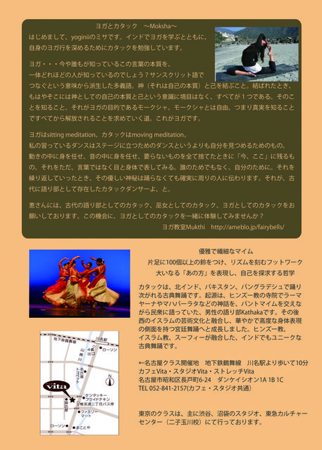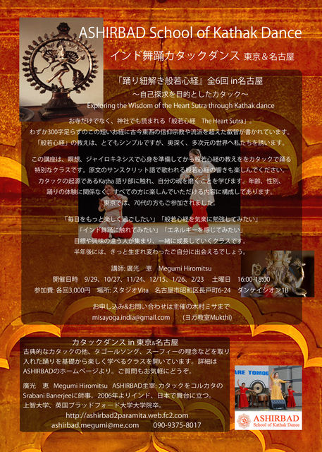 【定員に達しましたので、9月クラスの受付を終了いたします。問い合わせはお気軽にどうぞ(^^)】 皆様、こんばんは。ミサです。 私がインドでカタックダンスを習っているのは、ご存知かと思いますが、 日本でも少しずつ習ってレッスンしたいと思い、 東京から月に1回、名古屋へきていただくことになりました 9/29, 10/27, 11/24, 12/15, 1/26, 2/23 すべて土曜日、16:00〜18:00 参加費は各3000円です。 以下めぐみ先生より。 「踊り紐解き般若心経」全6回 in 名古屋 〜自己探求を目的としたカ