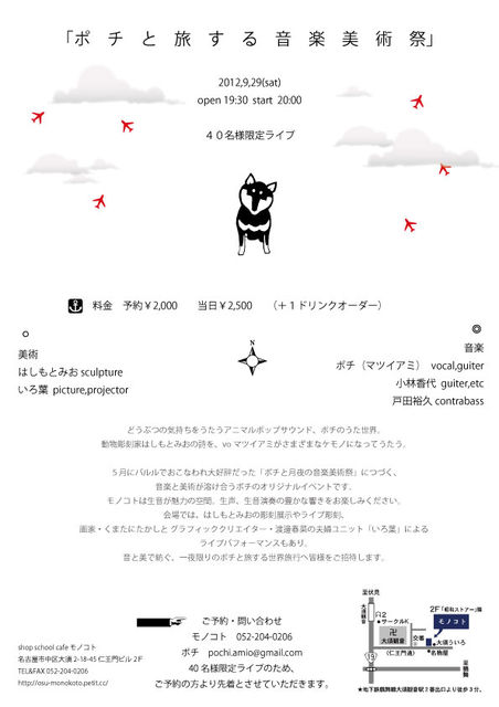 どうぶつの気持ちをうたうアニマルポップサウンド、ポチのうた世界。 動物彫刻家はしもとみおの詩を、voマツイマミがさまざまなケモノになってうたう。 5月にパルルでおこなわれ大好評だった「ポチと月夜の音楽美術祭」につづく、 音楽と美術が溶け合うポチのオリジナルイベントです。 モノコトは生音が魅力の空間。生声、生音演奏の豊かな響きをお楽しみください。 会場では、はしものみおの彫刻展示やライブ彫刻、 画家・くまたにたかしとグラフィッククリエイター・渡邊春菜の 夫婦ユニット「いろ葉」によるライブパフォーマンスもあり。