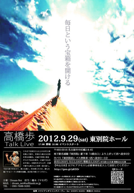 高橋歩トークライブ第5回 またご縁がありまして9月29日(土)に高橋歩トークライブをやることになりました! ぜひ遊びに来てください☆ スタッフも募集してますので、興味がある人は連絡下さいね^^ 現在NPOオンザロードとして震災支援をしながら家族4人で世界中を旅している歩さんが、愛知に立ち寄り、 最新情報やこれからやっていくこと、仕事のこと、仲間や家族、そして旅のことなどライブでしか聞けない内容 をトーク&映像で語ってもらっちゃいます! 今の自分に不満や不安がある人、もっともっと人生を楽しみたい人、これから