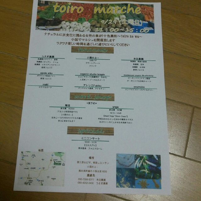 十色農和として初めてのイベントを開催させていたきます。 日時:9月29日(土) 11:00〜15:00 場所:器工房&石釜ピザ喫茶レストラン 小国のふ〜」 熊本県阿蘇郡小国町北里1800 イベント:12:00〜13:30 ☆南米音楽ミニコンサート 出店:ワークショップ ☆apola aiko ◎ポラロイド写真撮影 350円 野菜ソムリエでカメラ女子のaikoが思い出の一枚を撮影 ☆asari yoga class ◎ヨガショート30分 500円 要予約 14:15〜14:45 ※ヨガ