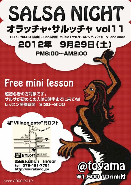 金沢サルサの皆さん いつもお世話になります イベント告知させてください さて毎年恒例のオラッチャサルッチャ秋の陣のご案内です。 11回目を迎えます。 ご機嫌なMusicとお酒で踊って楽しみましょう。 たくさんの方に遊びに来て頂けると嬉しいです。 よろしくお願いします。 2012年9月29日 土曜日 pm8:00スタート ¥1500 1ドリンク付 場所 村門 3階 ロフト (富山市上本町6−1 村ビル 3階) DJ カルロス(富山) Jaun (小松) 8時30分から初心者向け