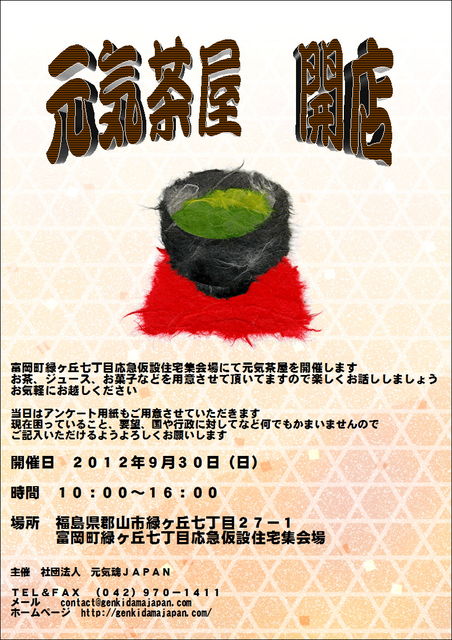 開催日 2012年9月30日(日) 時間 10:00〜16:00 場所 福島県郡山市緑ヶ丘七丁目27−1 富岡町緑ヶ丘七丁目応急仮設住宅集会場