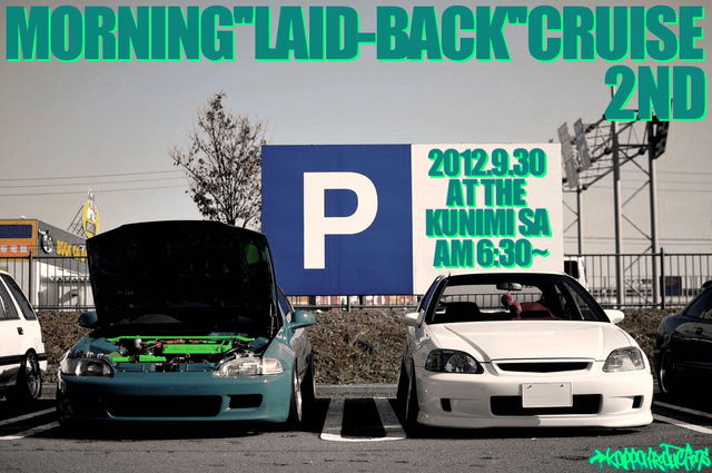 morning ‘’laid-back’’ cruise 2012 2ndの案内です。今回は9月30日にスポーツランドSUGOで行われるイベント''K day!!''の道中に合わせて東北自動車道 国見SA〜村田ICまでの高速クルーズの企画です。 日時:2012.9.30 東北自動車道 国見SA下り AM6:30頃集合〜AM7:00出発 出発後の流れは一切規制しません。そんな、自由でユルイ感じの集まりです。思い思いのスピードでクルーズや撮影を楽しんで下さい。 参加される方は意思表示としてマーカーを点灯して頂くと有り難いです。(そうでなくても点けてるかとは思いますが。。笑) ほんの短い区間