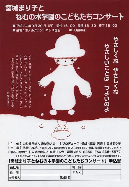 コンサートのお知らせです☆ _______________________________ 『宮城まり子とねむの木学園のこどもたちコンサート』 場所:宮城県塩釜市 ホテルグランドパレス塩釜(最寄駅:JR本塩釜駅) 日時:2012年9月30日(日) 時間:受付16:00 開演18:30〜終了18:00 定員:120名(※定員になり次第締切りになります) 主催:公益社団法人塩釜法人会 プロデュース・構成・演出・美術:宮城まり子 入場無料 〜チラシより〜 いかヾお過ごしですか。大変なことになって 心配していました。