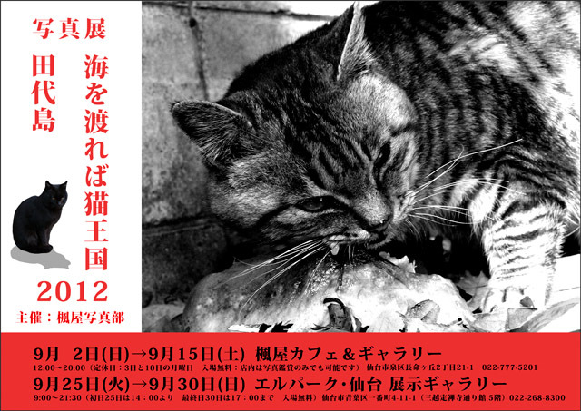 写真展 海を渡れば猫王国 2012 震災後の田代島と猫の写真展です。 仙台市青葉区一番町4-11-1(三越定禅寺通り館 5階) 紹介が遅れてしまいました。 開催は明後日の日曜にまでです。 アルバムなども多数置いてあります。 お近くの方はぜひお立ち寄り下さい。 よろしくお願いします。