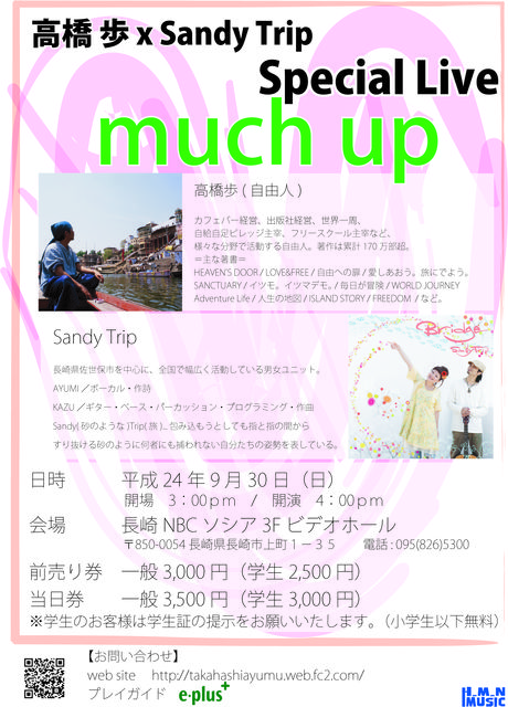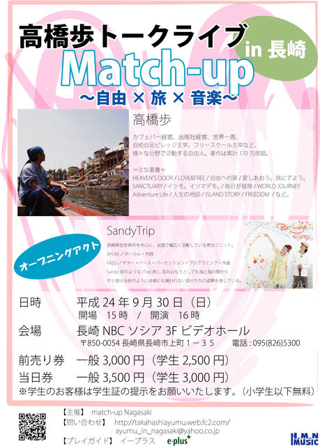 高橋歩トークライブ第2回開催決定!! 前回が大好評でご要望があったので、短期間で開催が決まりました。 また、前回よりもグレードアップ 地元長崎を中心に全国でも活躍されているSandyTripに オープニングアクトとして出演してもらいます。 音楽あり、歩さんの新しいトークあり 前回来れなかった方、前回来て頂いた方も 楽しんで頂ける内容になっていますので お友達や恋人、家族、または一人でも参加はもちろんOKです! また、前回に引き続き交流会を開催することが確定しました 交流会はできるだけ歩さん