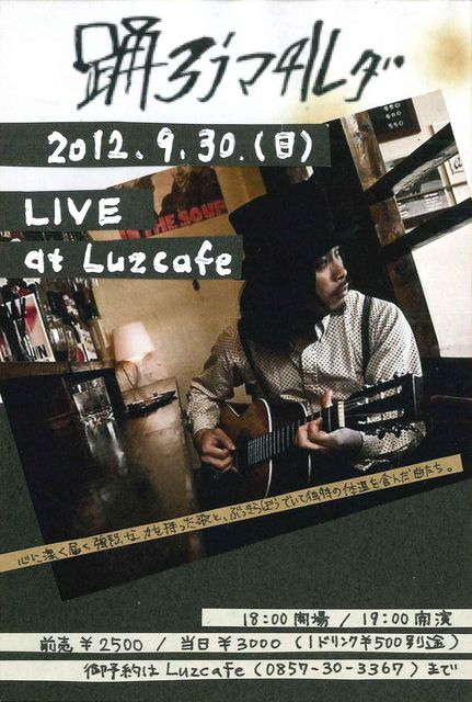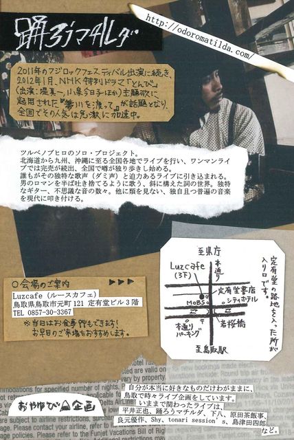 踊ろうマチルダ ワンマンLIVE @Luzcafe “心を震わす楽曲、魂のこもった" 心に深く届く強烈な力を持った歌と、ぶっきらぼうでいて独特の体温を含んだ曲たち。 2011年のフジロックへも出演に続き、2012年1月、NHK特別ドラマ「とんび」(出演:堤真一、小泉今日子)主題歌に起用された。 が話題となり全国でその人気は急激に加速中。 去年に引き続き今年も鳥取市Luzcafeでの弾き語りワンマンライブが決定しました。 ワンマンでは完売が続出。北海道から沖縄まで全国各地で、ライブのたびに噂を呼んでいる踊ろうマチルダの鳥取公演です!
