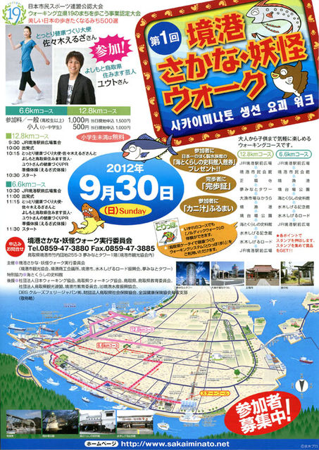 『第1回 境港さかな・妖怪ウォーク』が開催されます。 http://www.sakaiminato.net/site2/page/event/mizuki/1sakanayohkaiwalk/ 【日時】 2012年9月30日(日) 雨天決行 【日程】 12.8kmコース 9時30分 JR境港駅前広場集合 10時 出発式 10時15分 とっとり健康づくり大使・佐々木えるざさん、 よしもと鳥取県住みます芸人・ユウトさんの健康づくりPR 準備体操(えるざ式体操) 10時30分 スタート 6.6kmコース 10時30分