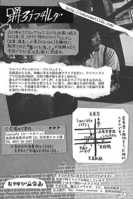 2011年のフジロック出演に続き、2012年1月、NHK土曜ドラマスペシャル「とんび」(出演:堤真一、小泉今日子ほか)主題歌に起用された『箒川を渡って』が話題となり、全国で急激に人気加速中の踊ろうマチルダ。 哀愁と力強さとを同居させた、印象的なしゃがれ声と、ぶっきらぼうでいて独特の体温を含んだ楽曲たち。 一度目にしたら決して忘れることのできない、迫力と魅力とを兼ね備えたライブです。 また本人の、素直で愛嬌のあるちょっと意外な一面が垣間見えるのも、ライブならではの楽しみ。 鳥取でも昨年12月のワンマン以降、再演を期待
