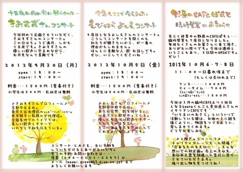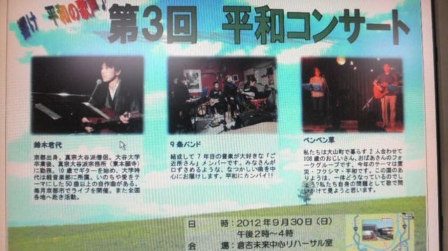 昨年も10月に鳥取と米子で平和コンサートに行かれたきみすずさんですが、 そのとき出会った方たちとのご縁で、今年も鳥取でコンサートです。 鳥取は、自然が豊かで、とってもあったかな人たちばかりです。 14時から、倉吉市の「倉吉未来中心」のリハーサル室でのコンサートは、 9条の会主催で、地元の「9条バンド」とうたごえデュオ「ぺんぺん草」さんと 3組の出演です。 そこからきみすずさんは大急ぎで、智頭町の言葉絵作家澤田直見さん(直ちゃん)の 野原のCAFEぽすと(写真の3枚目)に移動して、19時からコンサートです。