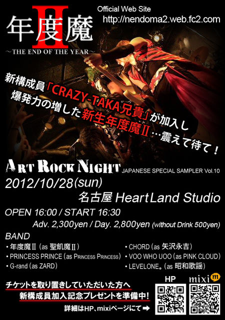 ☆出演時間が決まりました、年度魔IIは16:30〜のトップバッターになります!☆ 年度魔IIの約8ヶ月振りのミサ決定!※詳細は下にあります CRAZY-TAKA兄貴が加入した新生年度魔II、今まで以上にガッツンガッツン盛り上げていくぜ! 今回、年度魔IIを通してチケットを取り置きしていただくと、 「新生年度魔II 初ミサ記念プレゼント」があります!!! ※チケット1枚につき一個です。 取り置きしていただいた方にしかプレゼントの用意が出来ないので、 迷っている方や予定が不確定な方も申し込んでおいてもらえたらイイと思います♪ キ