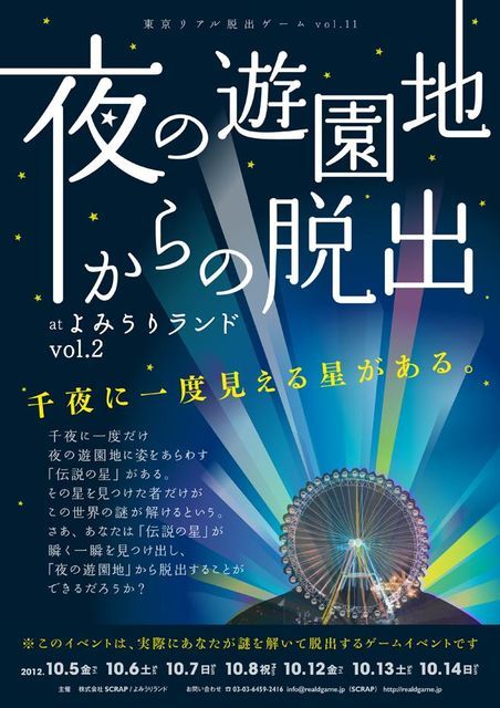 皆さん、お疲れ様です。 ブログやつぶやきでも告知や募集をかけましたが、正式にチケットが手に入ったのでSSTのイベントを立ち上げます。 皆さん、「リアル脱出ゲーム」って聞いた事がありますか? http://realdgame.jp/archives/category/about 要は謎解きイベントなのですが、ある施設 (e.g.東京ドーム、よみうりランド) を借りきって2時間程度で謎解きを行うイベントです 会場のサイズによって参加人数はまちまちですが、だいたい1公演あたり500〜1000人弱くらい 開始時に、ある紙や地図を渡されます そこにはなぞなぞ