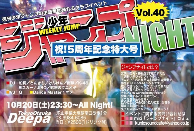 遂に10月で5周年!更なる詳細は後日発表! “ジャンプナイト”は一晩ジャンプ楽曲づくしのお祭りです。 内容、興奮度共に、最高テンションを続け今年の秋も探し物探しに行くのさ! いつもの皆さん、そしてもちろんはじめてご参加の方も大歓迎ですよ。 今回もお誘い合わせの上、ご予定頂けます様よろしくお願いしますね! ☆ご参加の方はこちらも是非一度読んでみて下さいね! http://mixi.jp/view_bbs.pl?id=52923068 特集のリクエストも受け付けております! “ジャンプナイトVol.40” 〜祝・5周年記念開催!〜 日時:2012/1