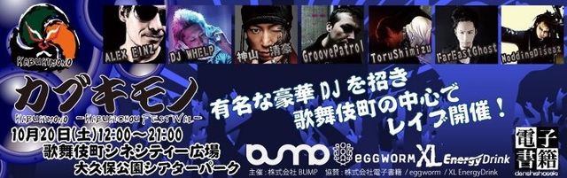 コミュニティ管理人様突然のイベント告知申し訳ありません コミュニティの趣旨に反するものでしたらお手数ですが、削除願います この度エンターテイメントの街歌舞伎町を舞台に、若者達で新しいエンターテイメントを提案! 大人から子供まで楽しんでいただけるレイブ&ライブの総合フェスティバル「カブキモノ」というイベントを開催させていただく事になりました。 【主催】 株式会社BUMP 【協賛】 歌舞伎町新興組合 【イベント名】 カブキモノ 【開催日時】 2012/10/20(土) 開場11:00〜 開演12:00〜 閉宴〜20:00