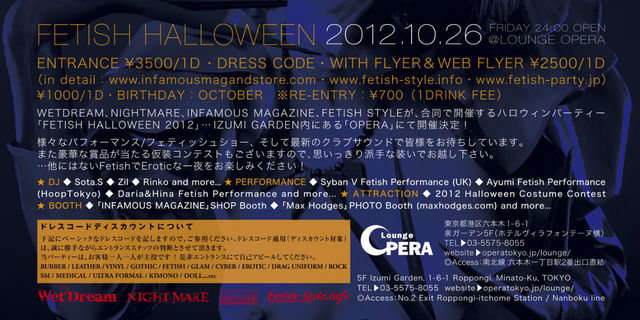 WET DREAM × NIGHTMARE INFAMOUS MAGAZINE × FETISH STYLE Presents FETISH HALLOWEEN 2012 2012.10.26.FRIDAY @ OPERA 24:00 OPEN [ENTRANCE] \3500/1D, \2500/1D・DRESS CODE・WITH FLYER&WEB FLYER \1000/1D・10月バースディ ※再入場:\700(1DRINK FEE) ・20歳未満のご入場を固くお断り申し上げます。 来場の際、必ず年齢を証明できるものをご掲示下さい。お持ちでない方は入場をお断りする場合がございます。予めご了承くださいますようお願いいたします。 Lounge OPERA TEL:03-5575-8055 operatokyo.jp 東京都港区六本木1丁