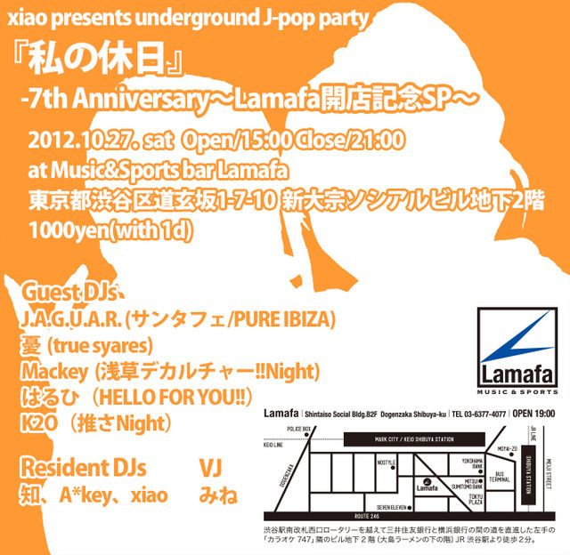 xiao presents underground J-pop party 『私の休日』 -7th Anniversary〜Lamafa開店記念SP〜 2012.10.27.sat Open/15:00 Close/21:00 at Music&Sports bar Lamafa:東京都渋谷区道玄坂1-7-10 新大宗ソシアルビル地下2階 1000yen(with 1d) Guest DJs J.A.G.U.A.R.(サンタフェ/PURE IBIZA) 憂(true syares) Mackey(浅草デカルチャー!!Night) はるひ(HELLO FOR YOU!!) K2O(推さNight) Resident DJs ::知、A*key、xiao VJ:みね Flyer Design:むきたま