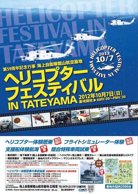 房総は館山にある海上自衛隊館山航空基地に遊びに行きます。 普段は入れない施設ですが、こういった日などのみ一般の人でも入れます。 ツーリングしながら見にいくのはいかがでしょう? 普段は見れない軍用車両や管制塔などが見学できます。 当日の見所はなんといっても抽選に当たればヘリコプターに乗れたり、 ゲームセンターどころではないフライトシミュレーターに乗れるかもしれないところです。 自分もこれを目的にがんばってみようかと。 厚生センターも開いてるようですから自衛隊内のレアお土産もあるかも? 10月7日 【集合
