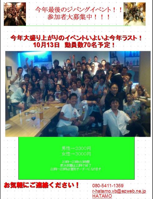 まだ募集中です! お早めにどうぞ♪ 10/13 今年最後のジパーング!!イベーント! これはもう参加しないと今年は越せない!? DJノリ頑張ります! プロジェクターでライブDVD流します(*^。^*) 料理はビュッフェ式です。 美味しい&ボリュームやばす(笑) 今回、オーナーさんの特別コース♪ ☆会費☆ 男性→3300円(お釣りが出ないようにお願いします) 女性→3000円 ☆時間☆ 20時〜23時の3時間 宴会は20時〜22時の2時間で終了 22時〜23時はその場に残っていて大丈夫です。 また、宴会に