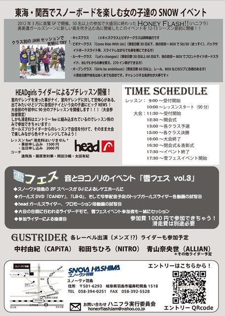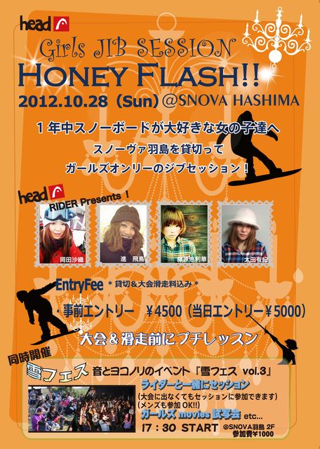 1年中スノーボードが大好きな女の子達へ スノーヴァ羽島を貸切って ガールズオンリーのジブセッション 東海・関西でスノーボードを楽しむ女の子達のSNOWイベント 2012年3月に高鷲SPで開催。50名以上の参加で大盛況に終わったHONEY FLASH!!(ハニフラ) 奥美濃ガールズシーンに新しい風を吹き込む為に開催したこのイベントを12-13シーズン直前に開催!! クラス別のJAMセッションで気軽にTRY ・キッズクラス (※キッズクラスとビギナークラスは同時進行です) ・ビギナークラス 『Come Ride Wit