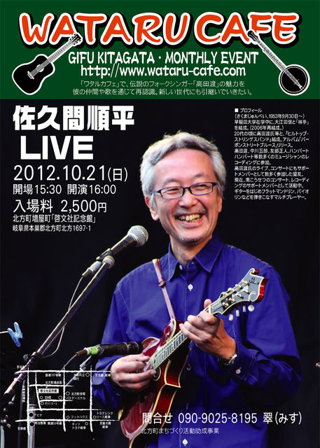 ●佐久間順平LIVE● 【日時】 2012年10月21日(日) 開場/15:30 開演/16:00 【会場】 啓文社記念館 【出演】 佐久間順平 【料金】 2500円 【予約・問い合わせ】 090-9025-8195