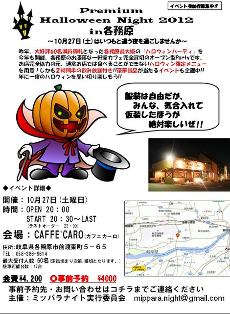 管理人様貴重なスペースをお借りします 【昨年大好評に付き今年も企画!!】 60名収容可能な各務原のお洒落カフェで各務原では稀なオープン型のハロウィンパーティを企画!! ハロウィンにちなんだ特別ディナーや2時間半の飲み放題などお店協力の元今回限りの特別コースをご用意!! 年に一度だけのハロウィンパーティーでおもいっきりハロウィンナイトを楽しみましょう。 ◆場所 カフェカーロ ◆日時 10月27日(土) OPEN20:00 START20:30〜 ◆住所 岐阜県各務原市前渡東町5-65 http://g.lets-gifu.com/shop/index-4