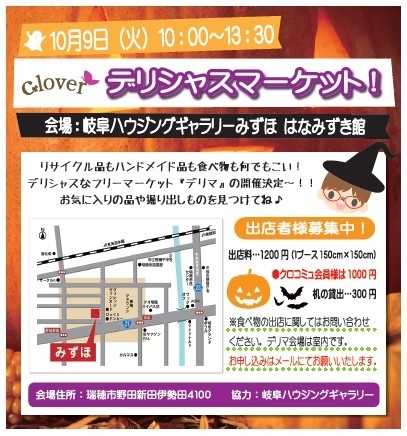 10月9日(火) デリシャスマーケット 10:00〜13:30 会場:岐阜ハウジングギャラリーみずほ内 はなみずき館 ハンドメイドもリサイクルも食べ物もそろう、名前通りデリシャスなイベント『デリシャスマーケット』 通常第2火曜日はモレラ岐阜でのハンドメイドマーケットですが、モレラさんのリニューアルオープンに伴い混雑が予想されるため、ハウジングギャラリーさんでのデリマ開催となりました お気に入りの品を見つけにいらしてくださいね ただ今出店者様を募集中です。 1ブース(1.5m×1.5m