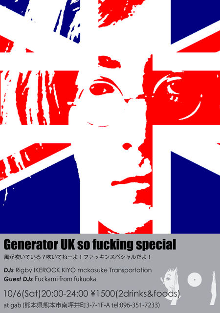 今週末は福岡でアフターフジですが、熊本では10月にso fucking specialなGeneratorやります!! UK Specialですよー☆ フジもUK祭りでしたしね♪ 先着20名にはDJ陣からのオススメソングを集めたコンピCDプレゼントです♪ お値段もリーズナブルになっておりますので、ご近所お誘いあわせの上是非! お待ちしてます。 http://log.optimistic.co/2012/09/generator-uk-so-fucking-special/