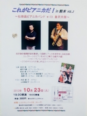 【これがピアニカだ!in熊本Vol.2】 ★両手弾き循環呼吸を駆使した超絶ピアニカを吹きまくる松田昌 ★エレクトーンとピアノをHOTに奏でる倉沢大樹 ★ハッピーでノリノリの松田昌ピアニカバンド 3つのサウンドが楽しめるスーパーライブ ぜひ来てくださいね〜! 【詳細】 ●出演 松田昌(ピアニカ) 倉沢大樹(EL・P) 松田昌ピアニカバンド(松田昌・島田聖子・岡野リキ・中村新) ゲスト 米田郁子(Dr)山本麻記子(EL) ●10月23日(火)19:30開演 ●レストランバーCIB(キーブ