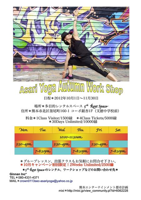 ダンスインストラクター、 コリオグラファーのMari Asariが、 Toronto Canada & Harlem NYCで学んできたヨガをお教えします。 ヨガはムービングメディテーションであり、 カラダのバランスを整え、健康になると同時に 精神的安らぎと集中力を得るためのものです。 自身、3年以上ダンサーとしての活動を休止し、 増加した体重、立ち仕事で悪化した腰痛を、 ヨガと食生活で10kg減量、改善し、 怪我なくダンス活動を再開でき、今も問題なく維持しております。 これもすべてヨガとヨガを教えていただいた先生方、 一緒にクラスをシェアし