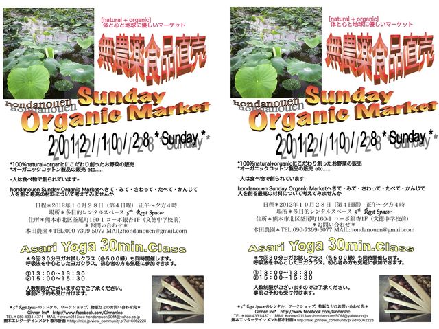 [natural + organic] 体と心と地球に優しいマーケット hondanouen 『Sunday Organic Market』 ・100%natural+organicにこだわり創ったお野菜の販売 ・オーガニックコットン製品の販売 etc..... ・30分ヨガクラス/1class500縁(1pm~,3pm~) -人は食べ物で創られています- hondanouen Sunday Organic Marketに きて・みて・さわって・たべて・かんじて 人を創る最高の材料について 考えてみませんか。 日程*2012/10/28(第4日曜日) 時間*12:00~16:00 *日程変更、時間変更、中止することもございますので、 ご了承
