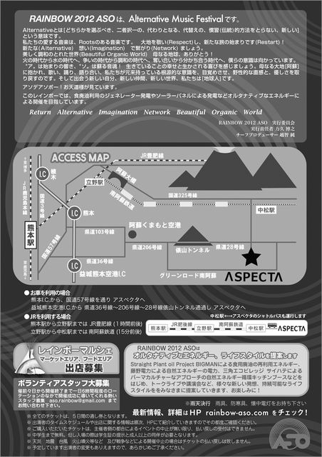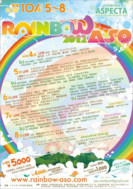 「RAINBOW 2012 ASO Alternative Music Festival」 ☆ http://www.rainbow-aso.com/ ☆2012年☆ 10月4日(前夜祭) / 5日〜8日 熊本県野外劇場 ASPECTA http://www.aspecta-aso.net/ RAINBOWが帰って来ました。 Facebook上にもグループがあります。 https://www.facebook.com/groups/200347573426562/ アクセス http://www.rainbow-aso.com/accessmap/accessmap.html http://www.rainbow-aso.com/