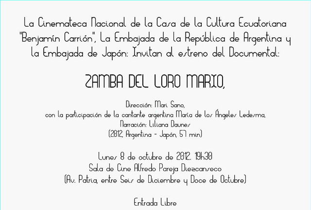 後援 アルゼンチン大使館、日本大使館、キト市文化庁、エクアドル文化庁