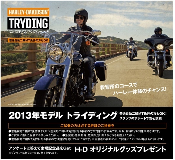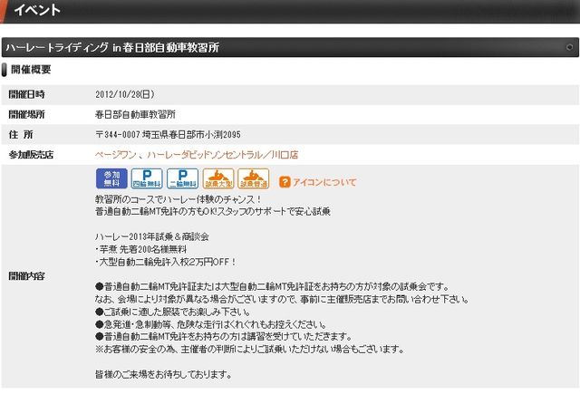 ハーレー トライディング in 春日部自動車教習所 第2弾 ハーレーの無料試乗会があります (゚∀゚*) ◆開催日時:2012/10/28(日) 開催時間;未定 ◆開催場所:春日部自動車教習所 http://www2.ocn.ne.jp/~kasukabe/index.html ◆住 所:〒344-0007 埼玉県春日部市小渕2095 ◆参加販売店:ページワン、 ハーレーダビッドソンセントラル/川口店 前回 楽しかったので ぜひ皆さんで! 重量感と世界のHDをぜひ体感(TωT)しましょう 無料です(TωT)(TωT) 当日は現地集合、解散を予定ですけど その辺は適当に★