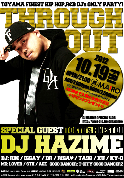 2012/10/19(金) @MAIRO THROUGH OUT! OPEN21:30 ADV:¥2000 DOOR:¥2500 ※入場時ドリンク代別途¥500必要になります。 ※23:30まで入場の女性の方はプラス1ドリンクプレゼント! SPECIAL GUEST: DJ HAZIME DJ: RIN / ISSAY / DR / RISA / TA98 / KU / KY-O LIVE: LOVER / STH / ACE GOGO DANCER: T-CITY GOGO DANCERZ