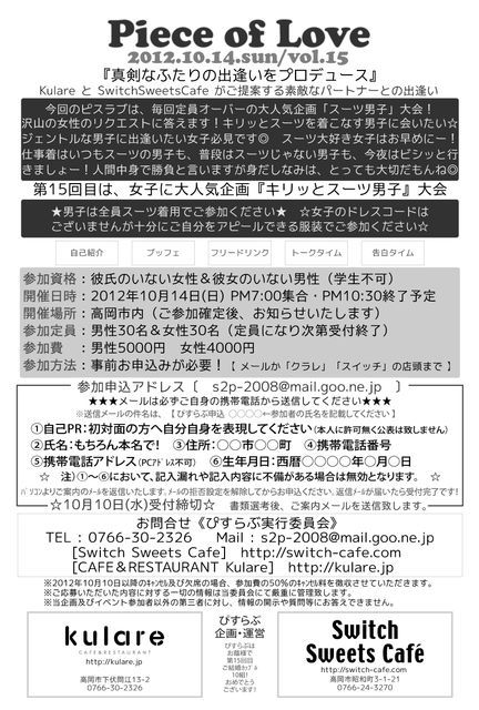 ぴすらぶの詳細決まりました! 今回、キリっとスーツ大会ってことで、男性にドレスコードがあります。 毎回、女性の応募が殺到するので、ご応募はお早めに☆ 開催日時:10月14日(日)19:00〜22:30 参加資格:学生不可。年齢制限なし 開催場所:高岡市内 定 員:各30名 参加費 :男性¥5000 女性¥4000 (フリーフード、フリードリンク) 事前申し込みが必要になります。(メールまたはkulare、switch sweets cafeの店頭にて) s2p-2008@mail.goo.ne.jpまで、下記項目を記載のうえ、ご自身の携帯電話よりご応募ください。 ?自