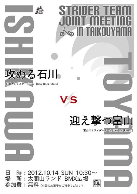 富山Kit Kit Riders + 金沢Ken Rock Stars 合同ミーティング ◆STRIDER TEAM JOINT MEETING in TAIKOUYAMA◆ 日 時:2012.10.14 10:30〜 場 所:太閤山ランド BMX広場 参加費:無料(ただし、小袋のお菓子をご用意ください) <内容(予定)> ・BMX広場de年齢別レース ・お菓子を狙ってよーいどん(お菓子食い競争) ・チーム対抗リレー(2歳→3歳→4歳→5・6歳→大人?) ・みんなでお弁当を食べよう 〜注意事項〜 ・オフロードコースでの走行となる為、ヘルメットに加え手袋の装備を必須と致します。 ・またプロテクター