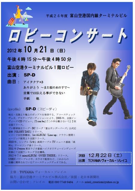 ■10月21日(日) 富山空港ターミナルビル ロビーコンサート 午後4時15分〜午後4時50分 場所:富山空港ターミナルビル1階ロビー ※お気軽に聴きにきてくださいね!