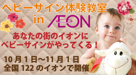 ベビーサイン体験教室がみんなの街のイオンにやってきます。 赤ちゃんと一緒に参加できる楽しい体験教室に参加してみませんか? 参加はなんと無料。 参加者にはうれしい、育児関連グッズがもらえるプレゼントつき。 お申込はこちらホームページから。すぐクリックしてね! 【高岡イオン開催日程】 各回定員40組 開催日 10月9日(火) 開催時間 第1回 11:00〜 第2回12:30〜 第3回14:00〜 (各回約30分) 開催店舗 全国110店舗 (日程会場は下記をクリック) 参 加 費 無料 お 申 込 参加にはご予約が必要です。