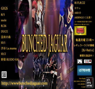 BUNCHED JAGUAR関東遠征、2本目のLIVE♪ 渋谷の次は新宿で!! 10/02(tue) HIDE&SEEK Vol.7 新宿RUIDO.K4 東京都新宿区歌舞伎町1-2-13 新光ビルB2 03-5292-5125 http://www.ruido.org/k4/ OPEN 17:30 / START 18:00 Ticket; adv¥2000+1Drink door\2500+1Drink act: BUNCHED JAGUAR (from 札幌)/光義 -Mitsugi- VOLGA/外山 晧二/Azurite/外山 晧三 チケット予約受付は下記から可能です。 http://bunchedjaguar.velvet.jp/Mail.html http://hp38.0zero.