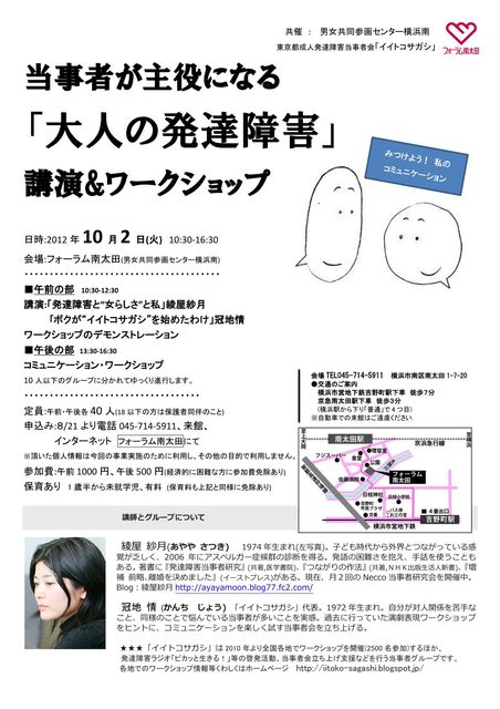 10月02日 (火) 「大人の発達障害」講演&ワークショップ〜当事者が主役になる〜 http://www.women.city.yokohama.jp/find-from-p/p-seminar/search/detail/?id=3433 場所:フォーラム南太田(横浜市南区南太田1-7-20) http://www.women.city.yokohama.jp/find-from-c/c-minami/ 内容 「大人の発達障害」への理解と、よいコミュニケーションをねがうすべての方に。 ◎午前の部(10:30〜12:30) 講演:綾屋紗月「発達障害と“女らしさ”と私」 冠地 情「ボクが“イイトコサガシ”を始めたわけ」 ワークショップのデモンストレーシ