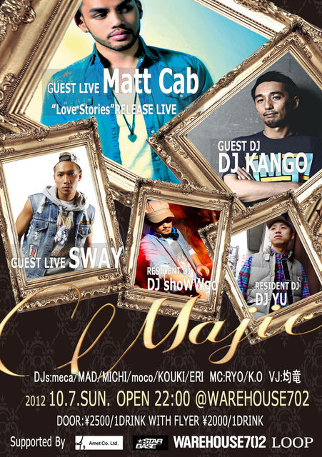 10/7「Majic@WAREHOUSE702」 5.30に開催されたMajicは”平日ながら500人”オーバーを動員したMonster Party!!月刊EXILE6月号に掲載!!今回は700人規模!! GUEST LIVEには『Matt Cab』,『SWAY』が出演! 『Matt Cab』“Love Stories” Release PARTY! GUEST DJには『DJ KANGO』も出演! さらに特別ゲストがくるかも!?? ◆Majic特典◆ ・先着300名様にルミカをプレゼント! ・Matt Cab直筆のサインを先着300名様の中から抽選で3名にプレゼント! ・SWAY直筆のサインを先着300名様の中から抽選で3名にプレゼン